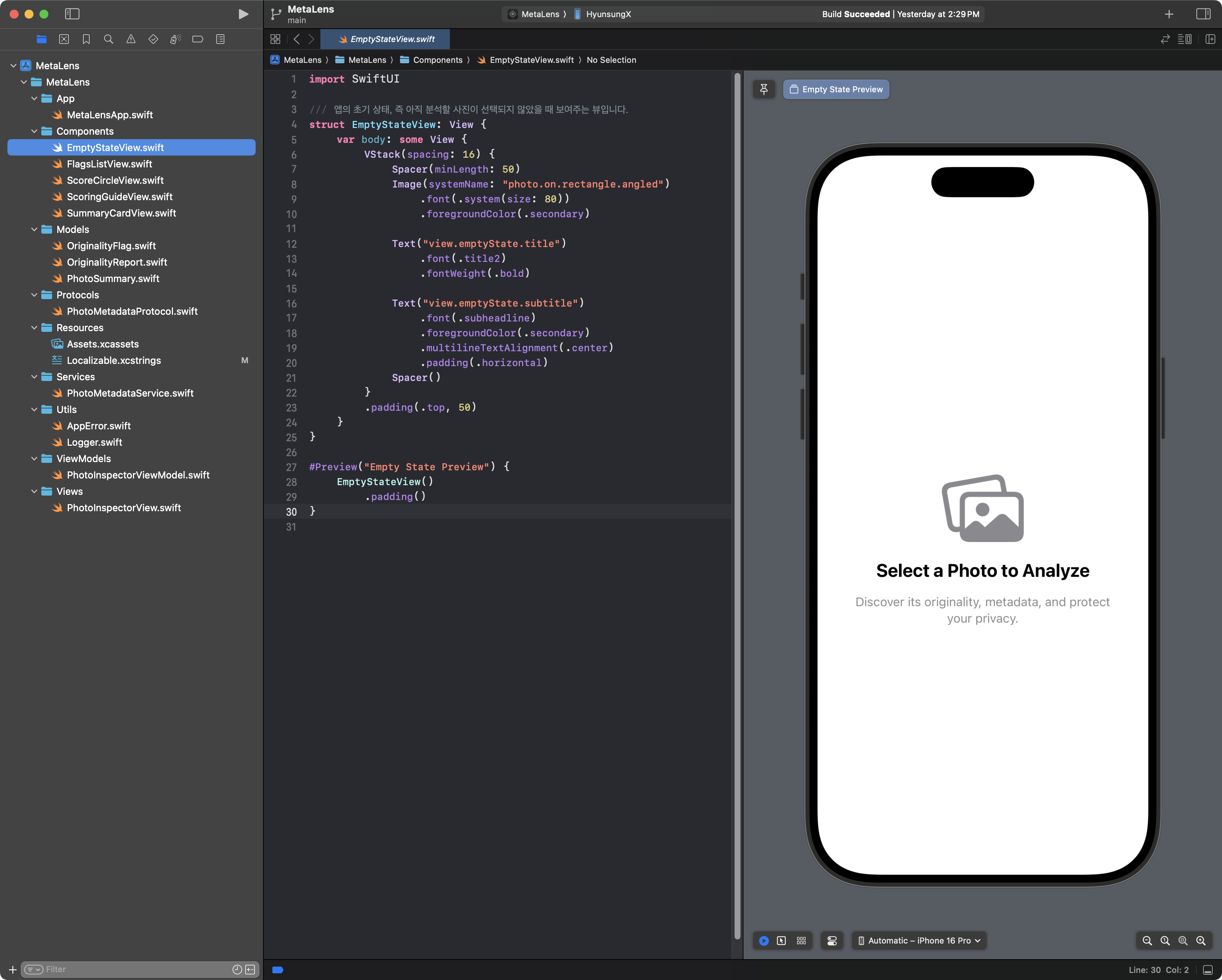 이제 잘 만들어진 '레고 블록'들을 모두 손에 쥐고 있다. 다음 포스팅에서는, 이 블록들을 조립하여 MetaLens의 최종 얼굴인 PhotoInspectorView를 완성하고, ScoringGuideView를 sheet로 띄우는 등 사용자 경험을 한 단계 끌어올리는 방법을 알아볼 것이다.