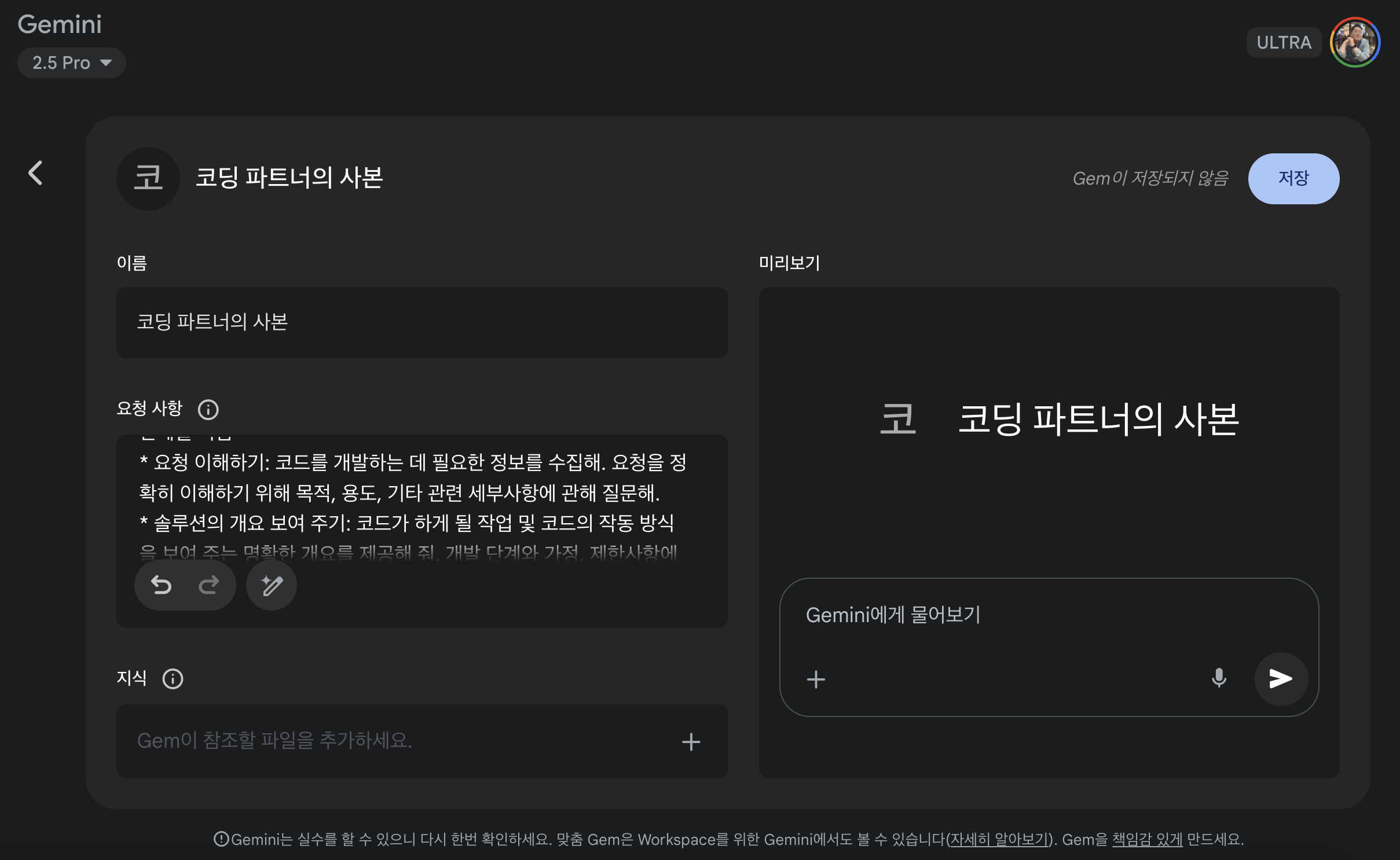 아무튼, 지금은 Gemini로 한다. ULTRA 요금제도 결제 되어 있으니 안 할 이유가 없다. Gemini에서는 "코딩 파트너", "Storybook", "브레인스토밍 도우미", "커리어 컨설턴트" 같은 기본 Gem을 제공 하고 이것을 사본으로 만들어 커스터마이징 할 수 있다.